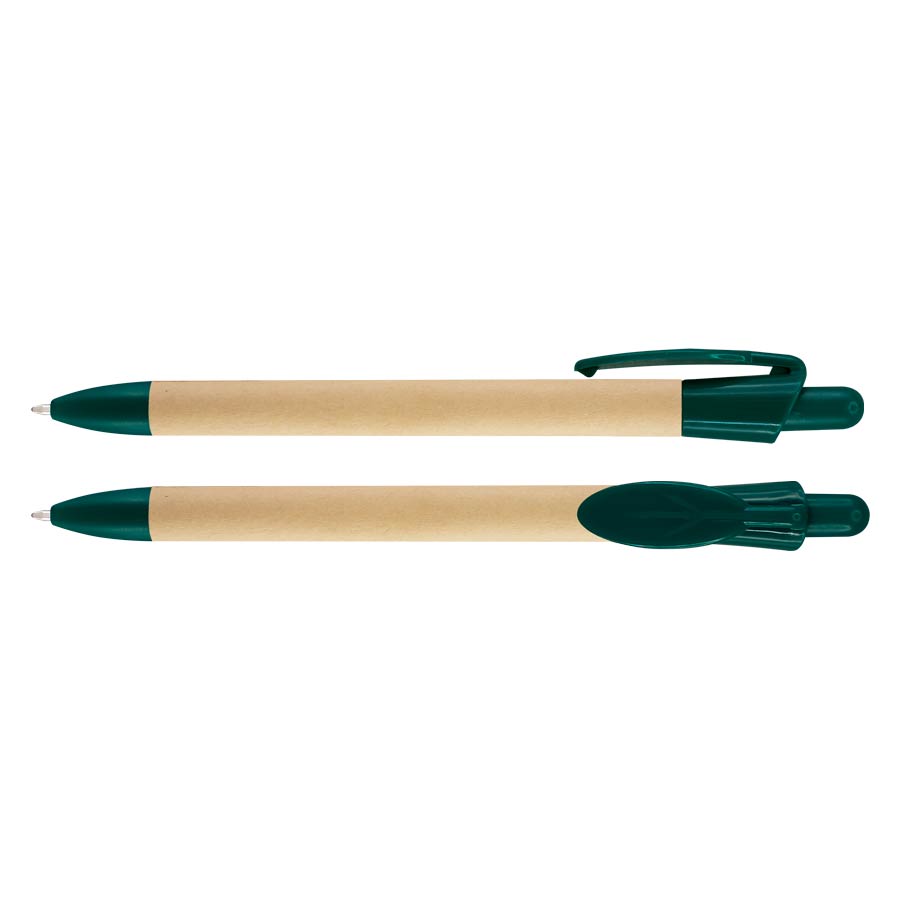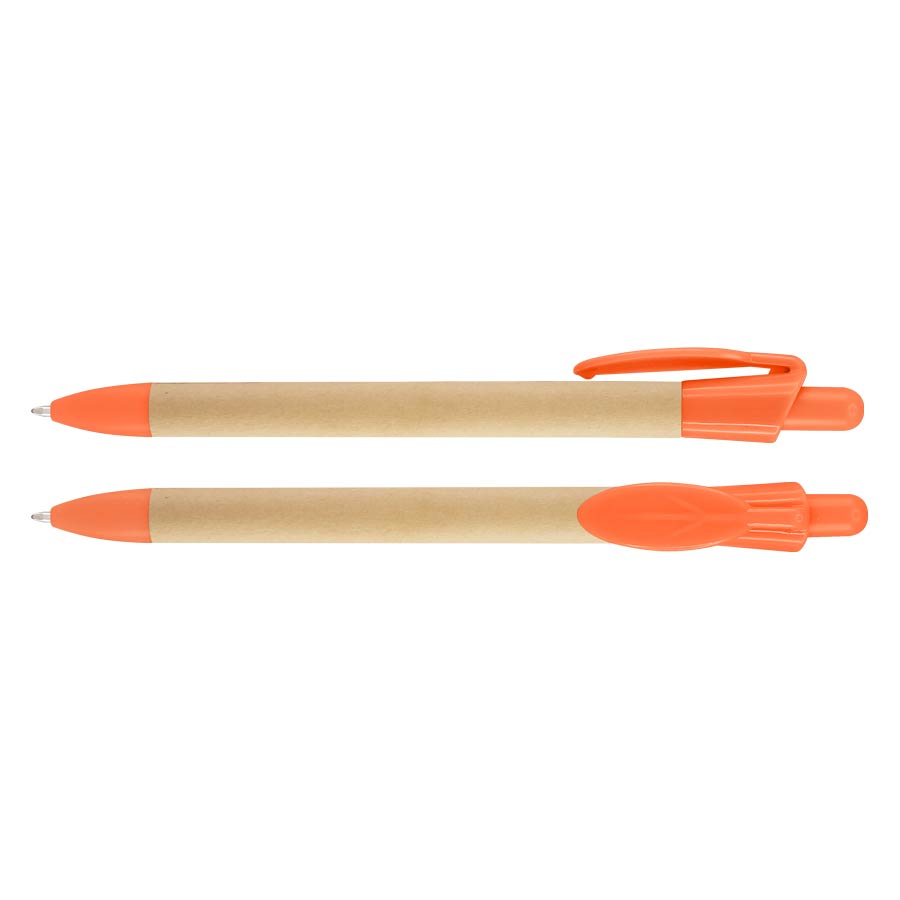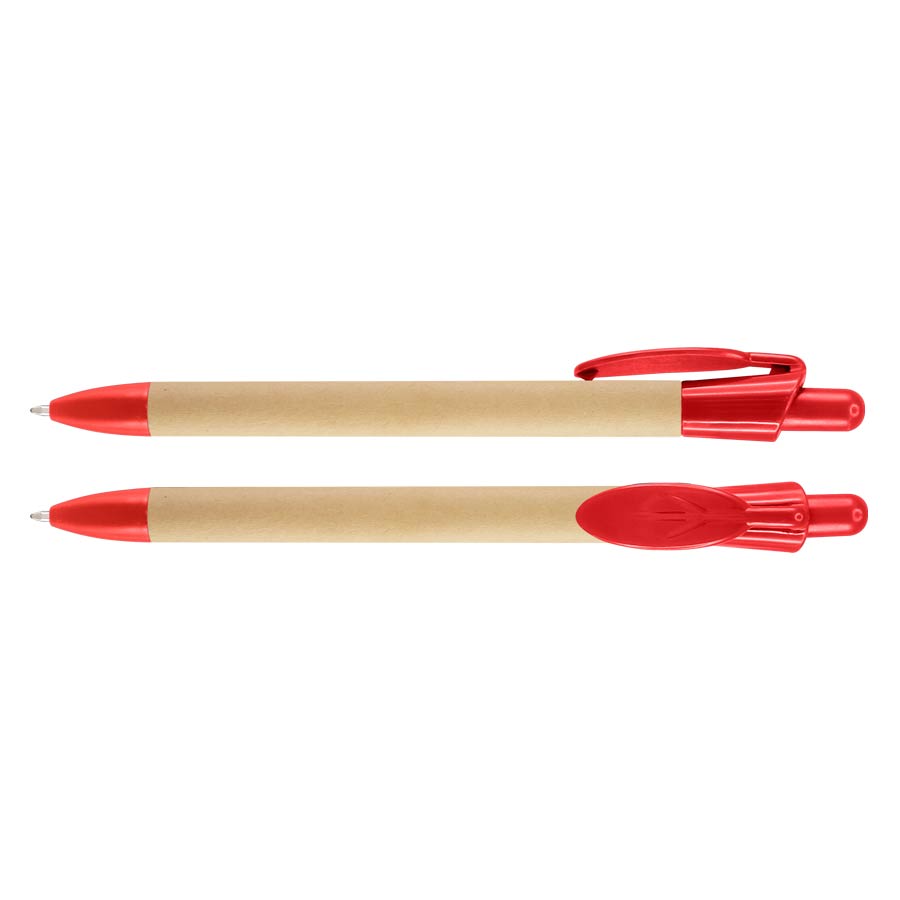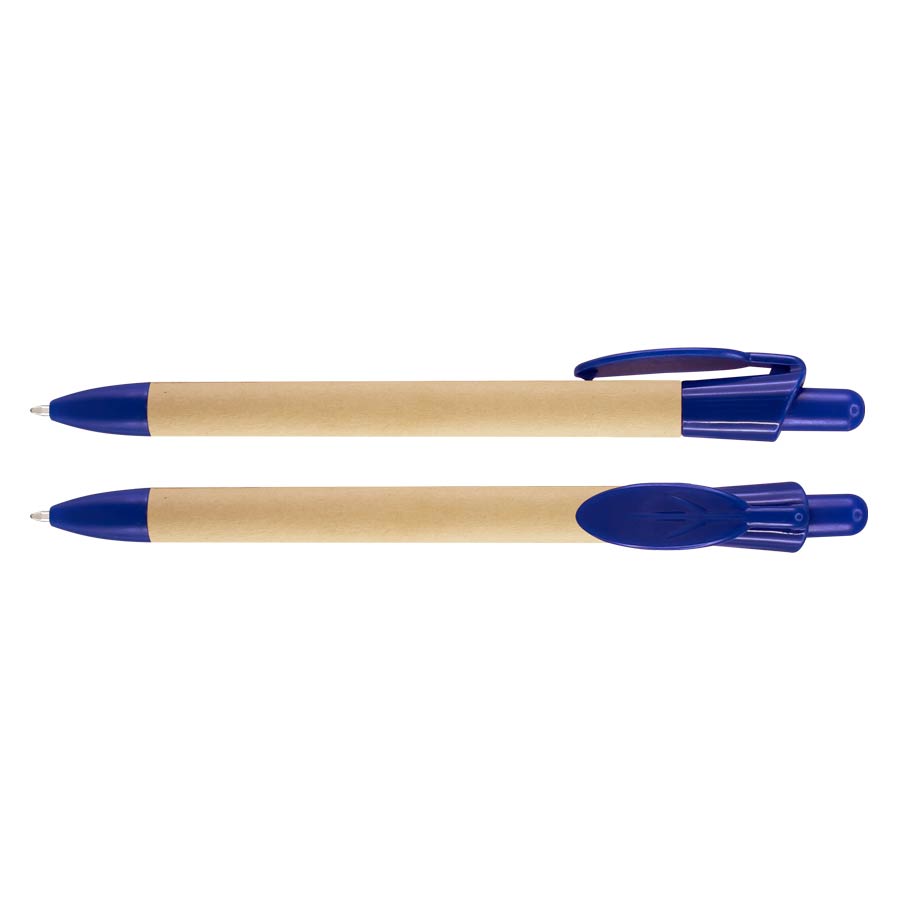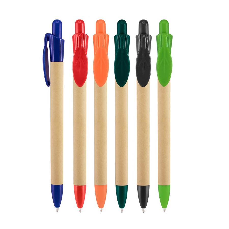 Bolígrafo Ecológico con cuerpo de cartón reciclado y clip plástico PET biodegradable con forma de hoja. Escritura azul.