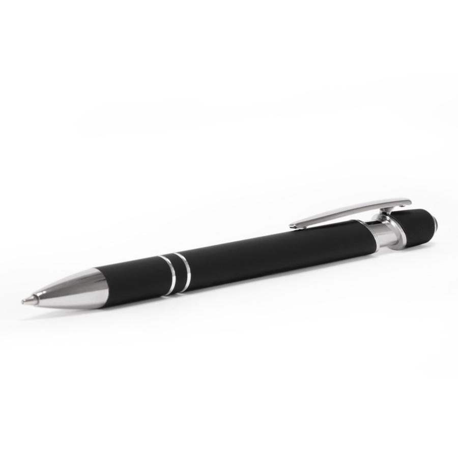 Bolígrafo metálico con cuerpo negro terminación rubber (gomoso) y terminal touch screen, para pantallas táctiles.