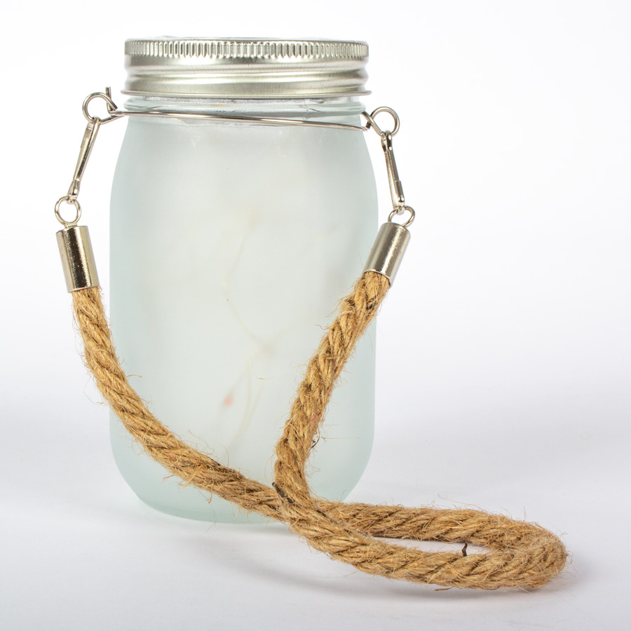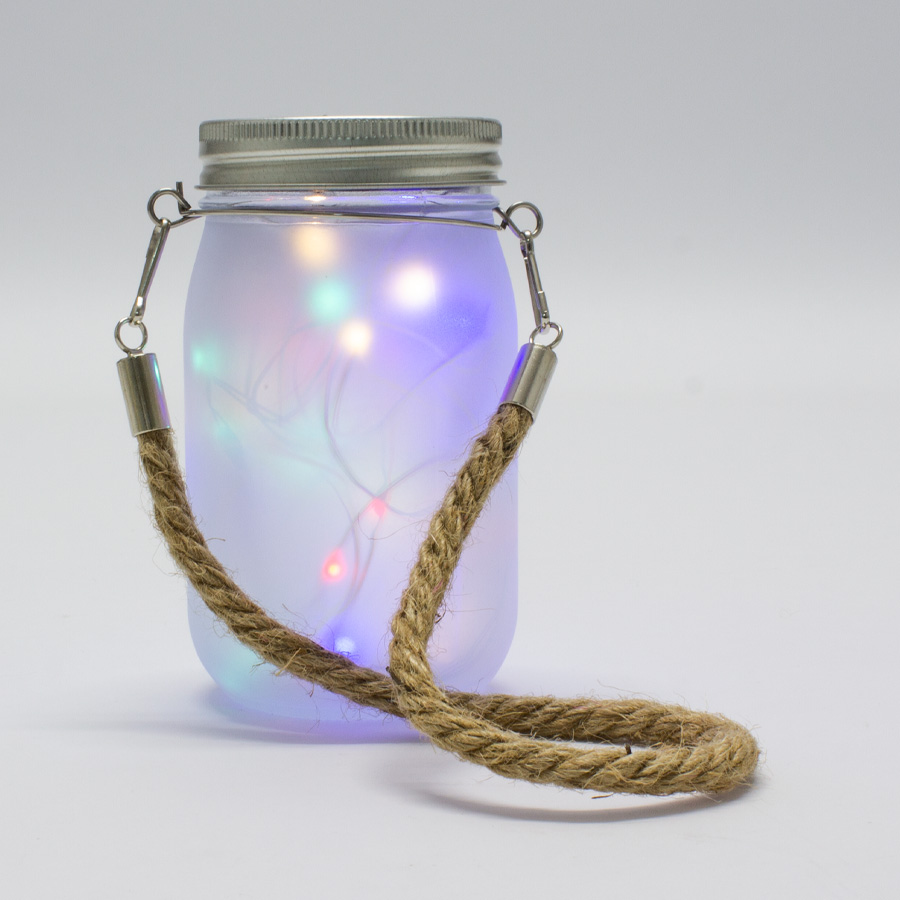 Farol para colgar, con forma de frasco y con tapa. Incluye cable con luces LED en el interior, que cambian de color. Sobre la tapa, contiene panel fotosensor, que permite que las luces LED se enciendan automáticamente cuando baja la luz-día.
